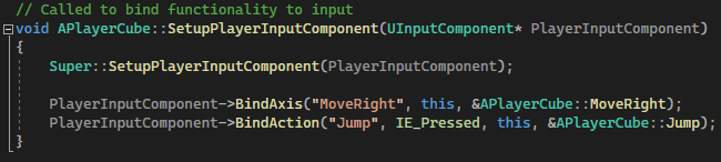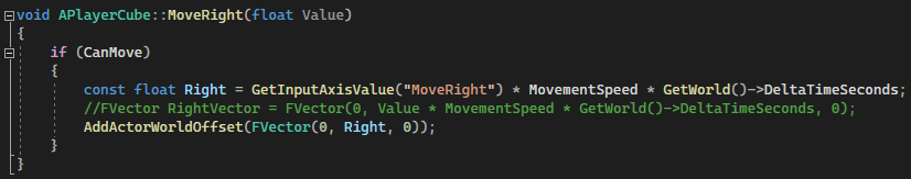 Player can only move left and right on a platform. Since it’s a Pawn class I used just AddActorWorldOffset to move player’s cube object.