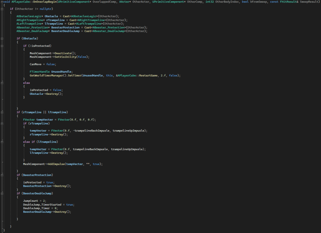 In the game I track overlaps with obstacles (to declare death), trampolines and boosters.