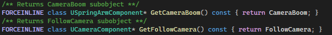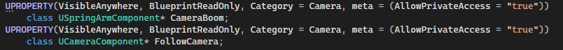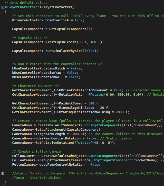 In the initialization of the PlayerCharacter.cpp I make references of variables, change some default values for moving and rotating. Also I set up everything for camera, just to be able to control it through code as well.