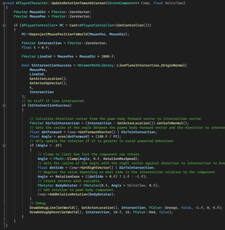 And I had to make the character to look in the direction of a mouse. The biggest problem for me was to correctly Clamp/Lerp the rotation of a character. So, basically here I get the line on which mouse from the player and rotate him step-by-step to that direction.