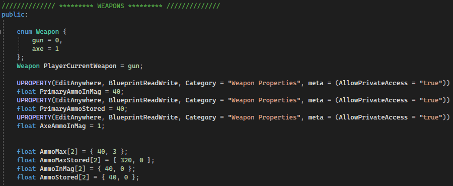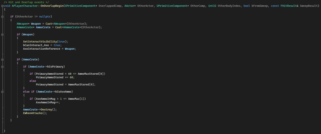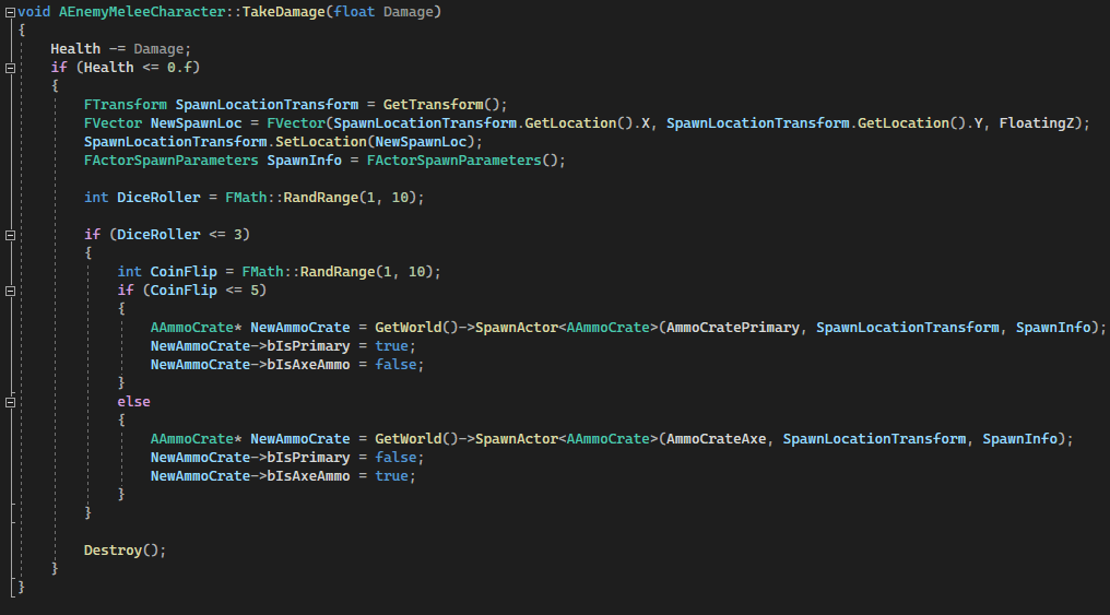 Whenever player’s projectile overlaps enemies, projectile’s code will see the overlap with a specific enemy and will call TakeDamage(float Damage) function in enemy’s code, so this is kind of implementation of OOP in C++. If enemy’s health <= 0 then enemy will die, and with 33% chance will drop ammo. If it procs then a coinflip (50/50) will decide is it gonna be a gun ammo crate on an axe crate.