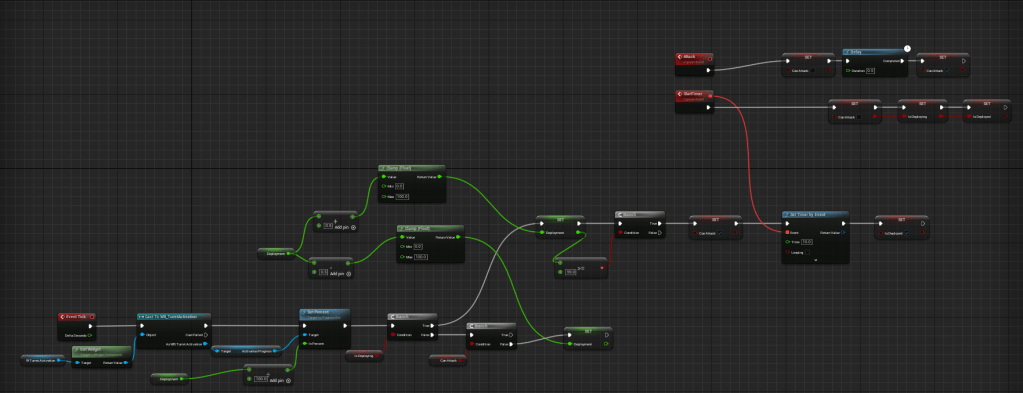 I also added activation turrets to the game. The idea was to put some objects like turrets on the map, player can get in a close proximity, hold an interact button or just stay still in the collision box to activate that turret for a specific amount of time. That turret will shoot every enemy it will see. This time I tried to use blueprint scripting: