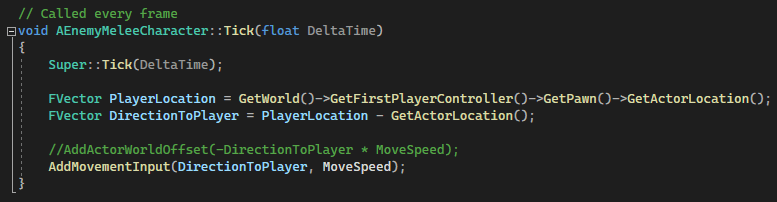 I created pretty simple enemies. Defined their movement speed and rotation rate in the BeginPlay, in Tick always reading player’s world location and receiving one forward vector direction to the player. Moves along this direction constantly.